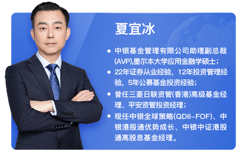 风险提示:文中观点不构成中银基金的投资建议或任何其他忠告,并可能随情况的变化而发生改变。基金有风险,投资需谨慎。基金管理人不保证基金一定盈利,也不保证最低收益。基金的过往业绩及其净值高低并不预示其未来业绩表现,基金管理人管理的其他基金的业绩并不构成对本基金业绩表现的保证。在市场波动等因素的影响下,基金投资存在本金损失的风险,并在少数极端情形下存在损失全部本金的风险。投资者投资基金前,需充分了解基金的产品特性及投资风险,并承担基金投资可能出现的亏损。请投资者在进行投资决策前,仔细阅读基金合同,招募说明书、产品资料概要等文件,了解基金的具体情况,根据自身投资目的、投资期限、投资经验、资产状况等判断基金是否和投资者的风险承受能力相匹配,并按照销售机构的要求完成风险承受能力与产品风险之间的匹配检验。中银全球、中银港股通、中银中证港股通高股息属于R4风险等级产品,适合经客户风险承受等级测评后结果为C4型及以上的投资者。在代销机构认申购时,应以代销机构的风险评级规则为准。中银全球、中银港股通及中银中证港股通高股息可能或将会投资港股通标的股票,将面临需承担汇率风险、境外市场风险以及港股通机制下因投资环境、投资标的、市场制度以及交易规则等差异带来的特有风险。中银全球可能的面临的风险包括市场风险、信用风险、流动性风险、操作风险、管理风险等。由于本基金将投资于海外市场,因此一方面基金净值会因全球市场的整体变化而出现价格波动。另一方面,各国各地区处于不同的产业经济循环周期之中,这也将对基金的投资绩效产生影响。同时,境外证券市场因特有的社会政治环境、法律法规、市场状况和经济发展趋势,对于特定负面事件的反映存在诸多差异;另外,部分投资市场如美国、英国、香港等证券交易市场对每日证券交易价格并无涨跌幅上下限的规定,使得这些国家或地区证券的每日涨跌幅空间相对较大等。上述因素可能会带来市场的急剧波动,从而导致投资风险的增加。指数历史数据并不代表或预示具体基金的业绩表现。我国证券市场运作周期较短,不能反映市场发展的所有阶段,基金有风险,投资需谨慎。