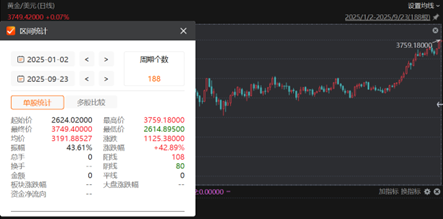 9月22日,金价再创新高,盘中触及3750美元/盎司,今日继续走高。9月以来,现货黄金价格接连上涨,回顾今年以来的黄金市场表现,现货黄金累计涨幅超1100美元,涨幅超40%。(数据来源choice,截至2025/9/23,13:30)