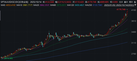一路攀升的黄金又到了新“高度”。10月13日,伦敦金现货价格收在4110美元/盎司上方,今日盘中一度逼近4200美元/盎司,随后高位震荡加剧有所回落。10月以来,伦敦金现货价格迅速攀升至4100美元/盎司以上,年内涨幅已超过57%。(数据来源wind)