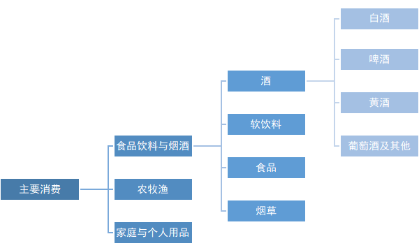 比如,中证的主要消费(一级行业),可以细分为食品饮料与烟酒、农牧渔、家庭与个人用品3个二级行业;食品饮料与烟酒(二级行业)分为酒、软饮料、食品、烟草4个三级行业;酒(三级行业)可分为白酒、啤酒、黄酒、葡萄酒及其他4个四级行业。