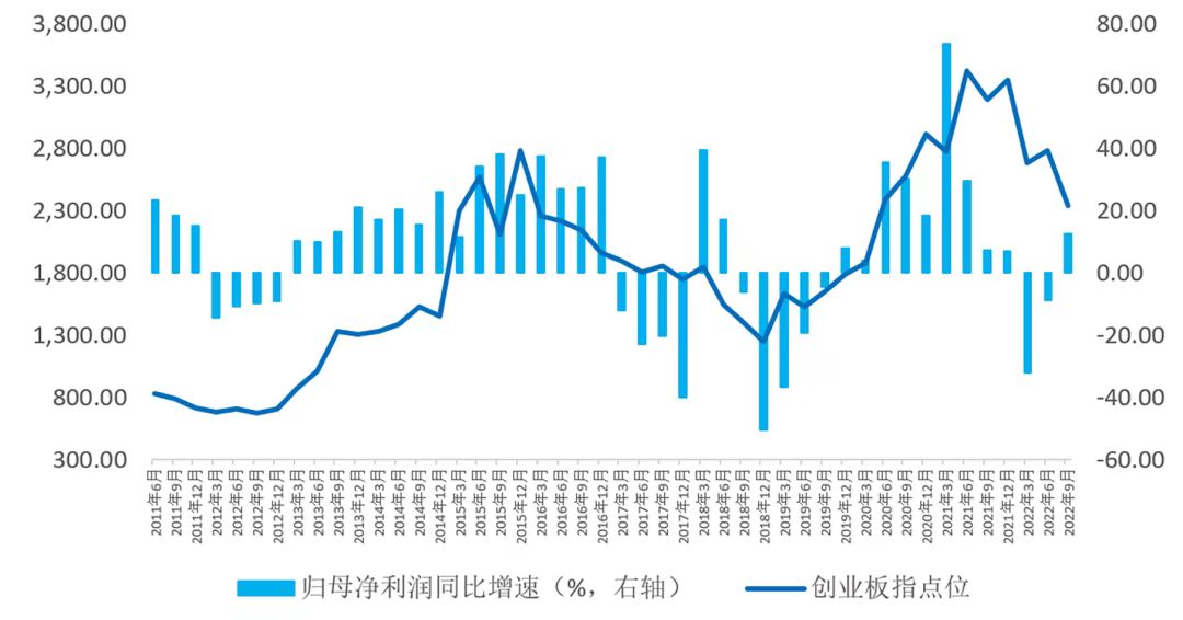 以创业板指数为例,2011年-2022年,在归母净利率增速为正且增速加快的时间区间,创业板指数展现出了更大的弹性,快速走高;而当归母净利润同比增速减速或者转负之后,创业板指数也出现了比较明显的调整回落(见下图)。