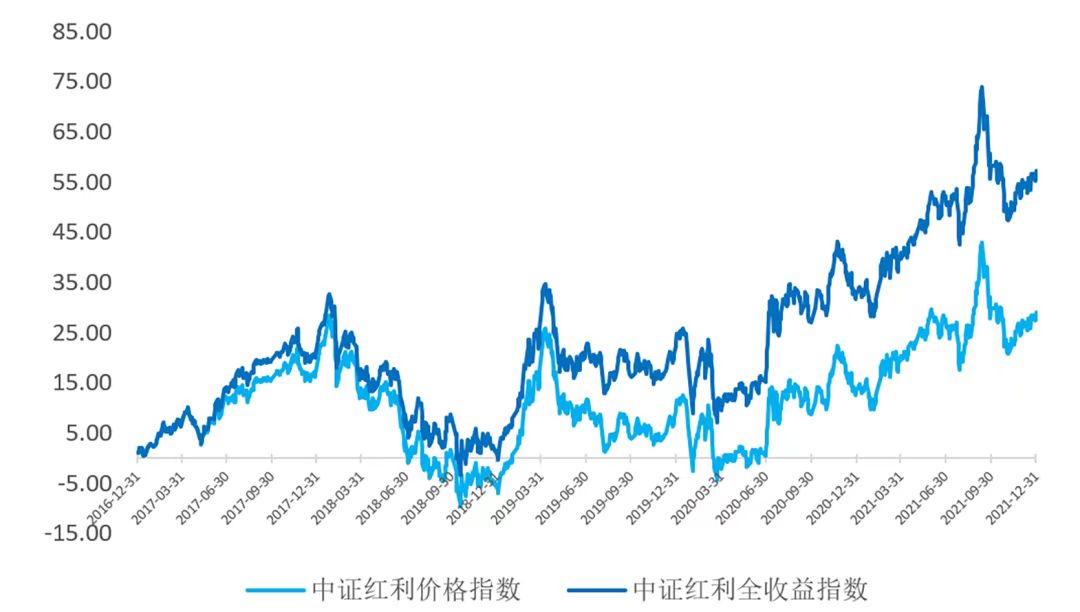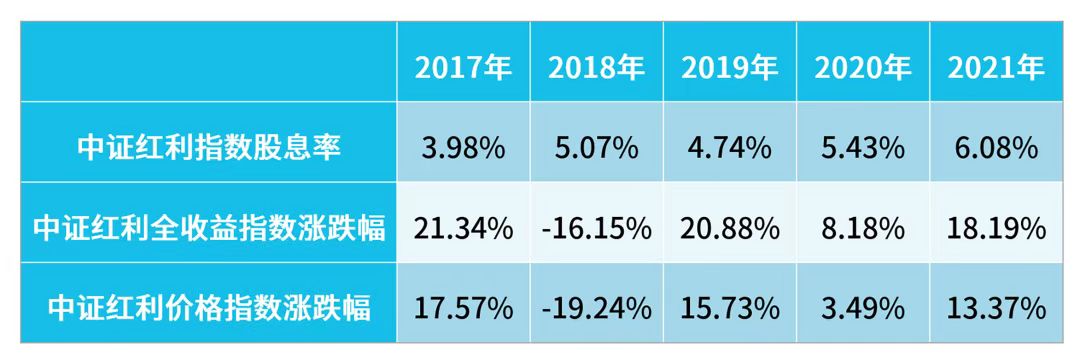 以中证红利指数为例,近5年来成份股股息率稳步提升,红利全收益指数表现也明显高于红利价格指数。特别是在市场行情较好的2017、2019和2021年,通过红利再投资的复利效应,进一步放大了投资收益;而在行情不好的2018年通过分红一定程度上减少了指数下跌幅度(见下表)。