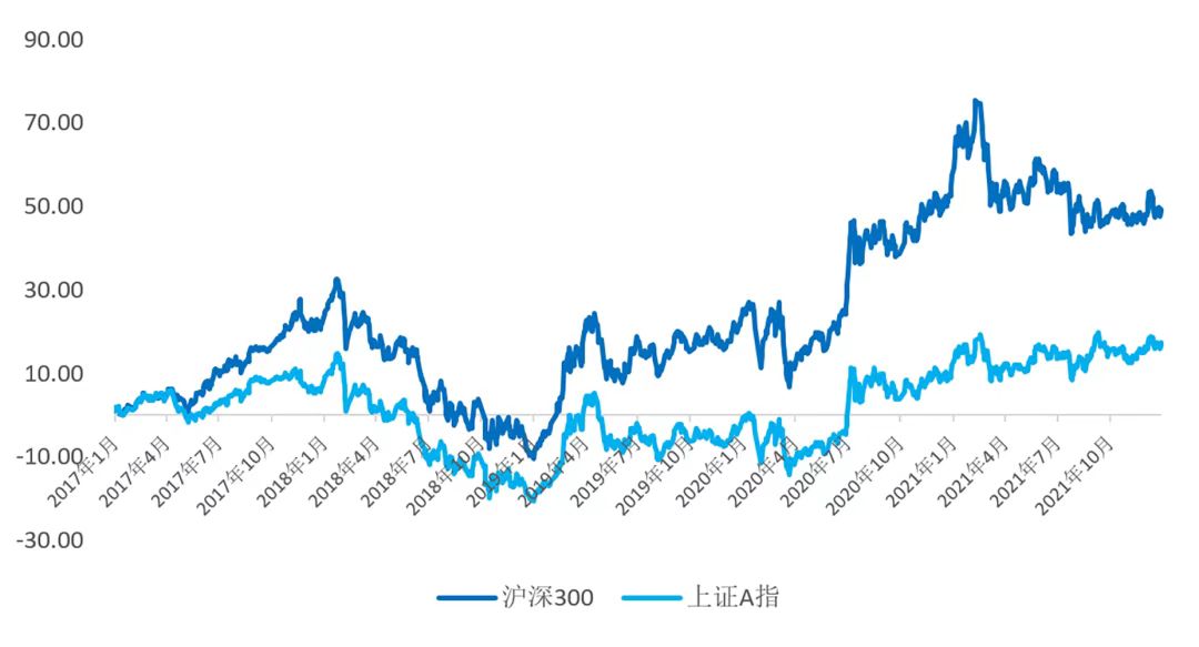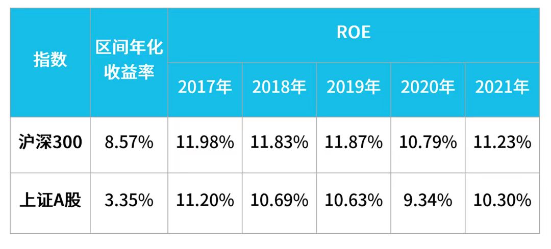 一般而言,盈利能力越强的指数,中长期来看收益率也越高。以沪深300和上证A股指数为例,2017-2021的完整5年间,沪深300每年的ROE均高于上证A股指数;同期,指数沪深300指数年化收益率为8.57%,也明显高于上证A股的3.35%。