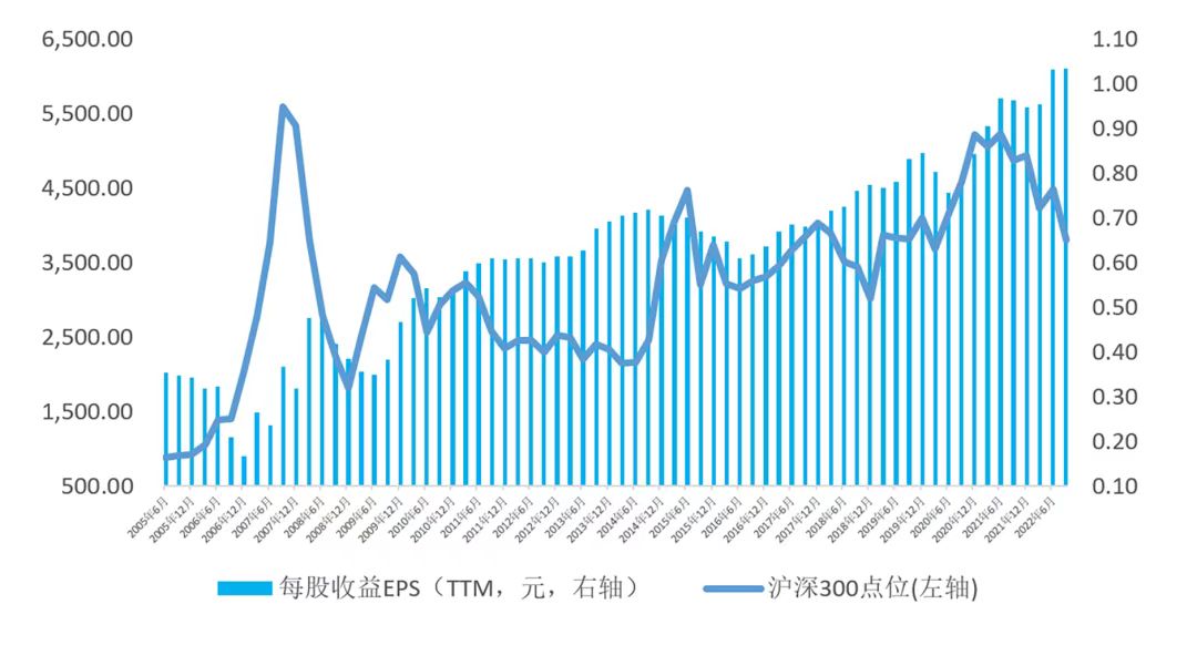 从长期持有指数的角度来看,获得的回报归根到底还是成份股创造的税后总收益。回顾沪深300指数的长期走势与每股收益可以发现,由于受到估值等因素的影响,指数会阶段性上下波动,甚至大起大落,但是长期来看,指数走势与每股收益的变动趋势相关性较高(见下图)。