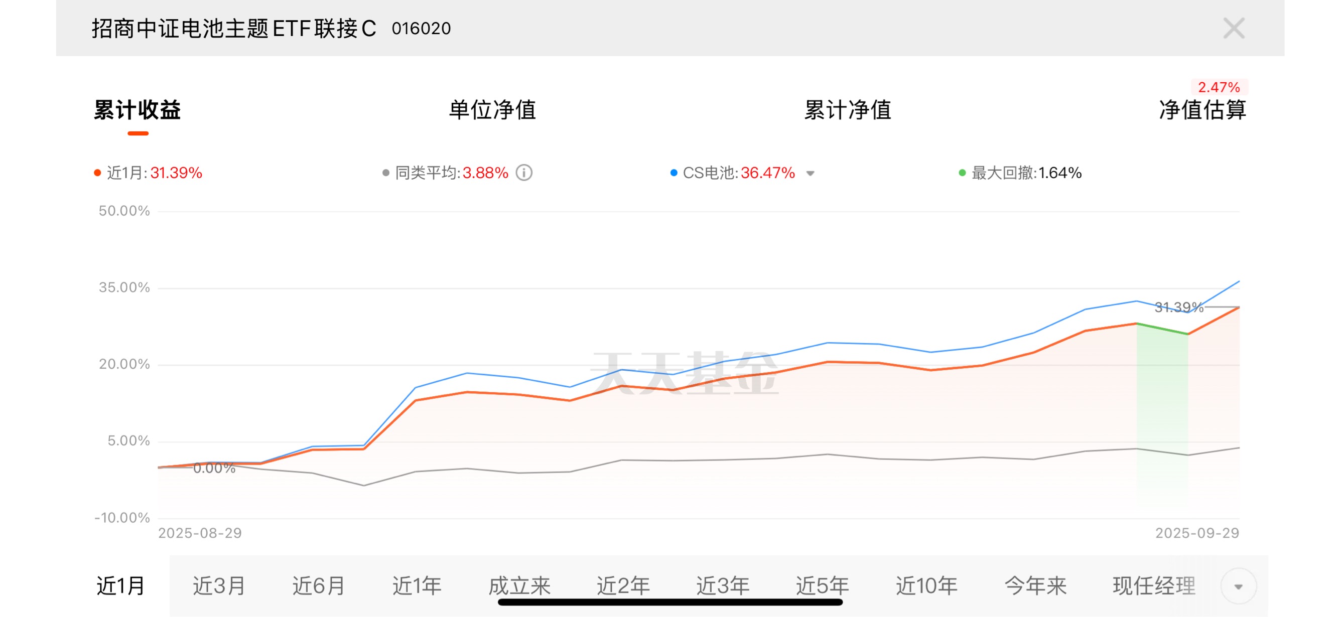 昨晚电池股涨得热闹,今天指数2.43%继续走高。这指数弹性大,固态电池占比高,招商中证电池主题ETF联接C近1个月31.39%,布局太值了。