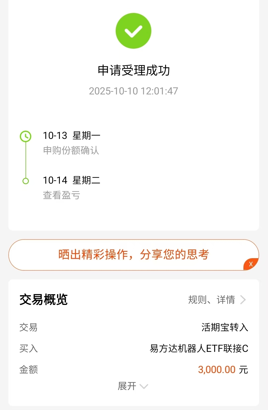今天股市行情调整,错过节前行情的我又有补仓机会了,今天机器人终于等到小幅回调上车机会,在科技板块大跌情况下,机器人跌幅比较小,说明支撑力量还是很强的,而且我觉得买机器人还得选国证指数,近1年涨幅比中证机器人高出快10个点。因为他人形机器人占比较高,而人形机器人又是今年机器人主线,我加仓的是$易方达机器人ETF联接C(OTCFUND|020973)$,他业绩优秀,大家也可以关注一下。