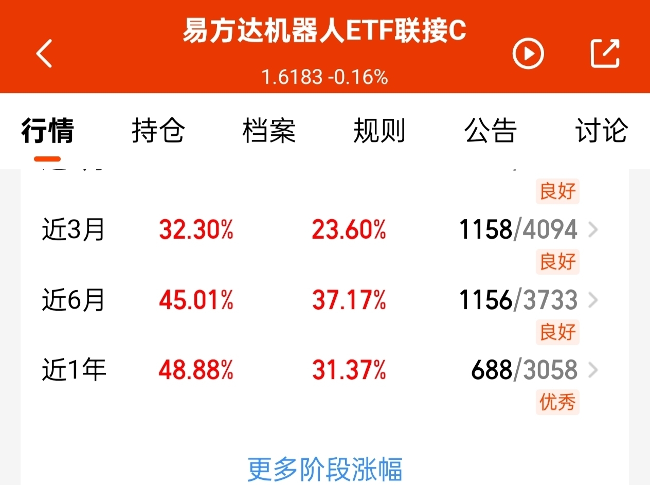 今天市场有点调整,三大指数都跌了。我看了看自己关注的基金,发现$易方达机器人ETF联接C$ 最近表现挺稳的。虽然科技股普遍在跌,但这个机器人基金近1个月涨了7.52%,近3个月更是涨了32.30%,比其他板块抗跌多了。