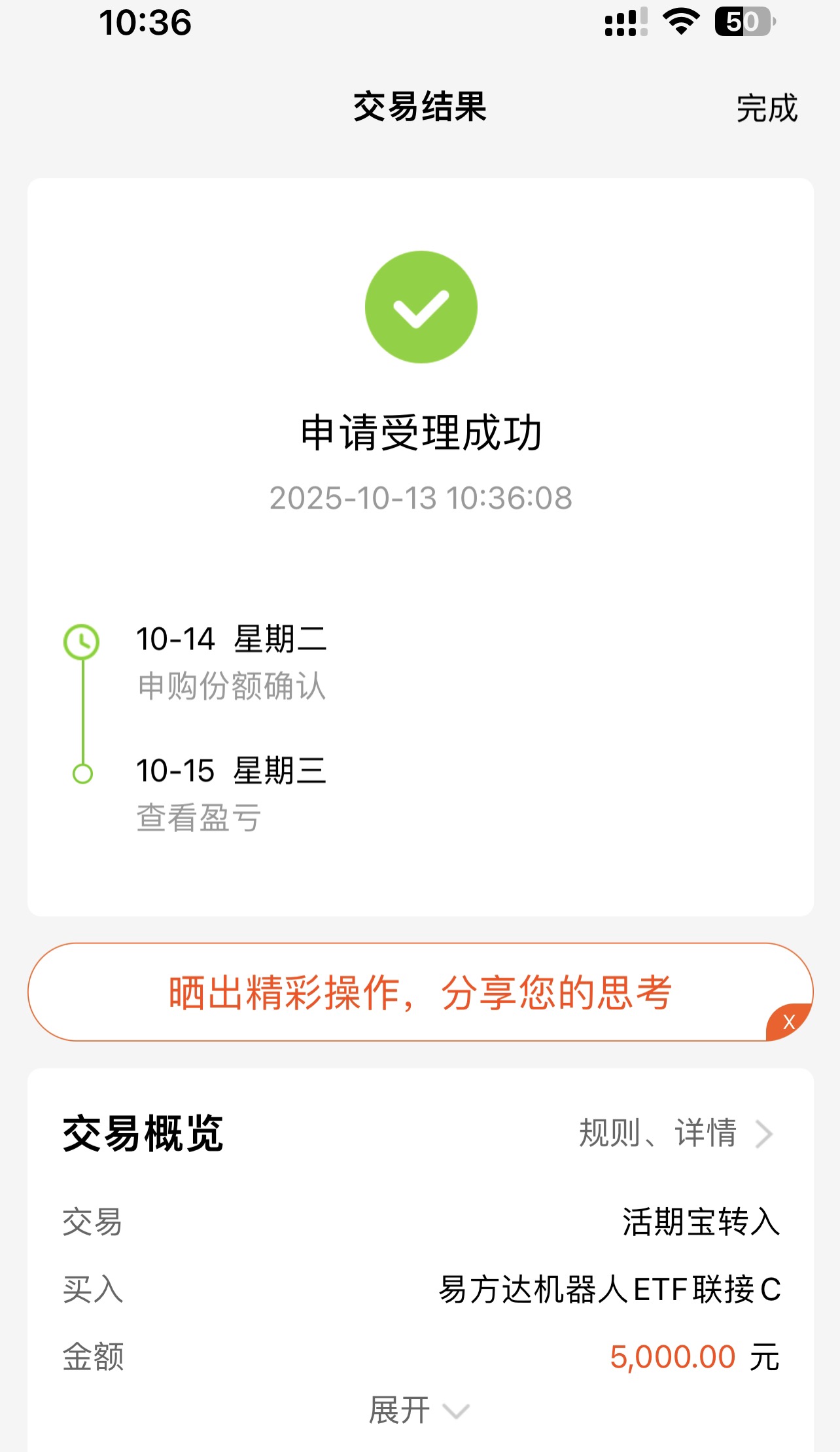 今天机器人板块出现明显调整,正好给了久等的上车机会。我趁势加仓5000元易方达机器人ETF联接C,布局长期确定性赛道。短期波动不改中线逻辑——从产业政策到企业落地,人形机器人正迎来爆发前夜。