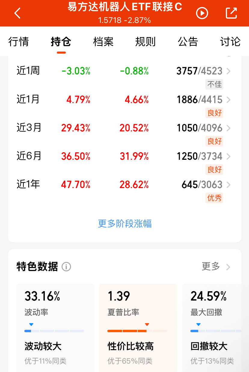 今天股市延续调整,三大指数集体下跌,其中机器人跌幅较大,不过也终于等到上车机会了,感觉看机器人还得选国证指数,近1年涨幅比中证机器人高出快7个点,国证机器人指数中人形机器人占比更高(超70%),明显高于中证机器人指数(约60%),打算布局一波$易方达机器人ETF联接C(OTCFUND|020973)$啦!$中航机遇领航混合发起C(OTCFUND|018957)$$中欧中证机器人指数发起C(OTCFUND|020256)$$华夏中证机器人ETF发起式联接C(OTCFUND|018345)$$天弘恒生科技ETF联接C(OTCFUND|012349)$$华夏成长混合(OTCFUND|000002)$$天弘中证机器人ETF发起联接C(OTCFUND|014881)$#稀土价格暴涨37%!稀土板块狂飙##券商把脉:冲击小于4月 黄金坑再现?#@