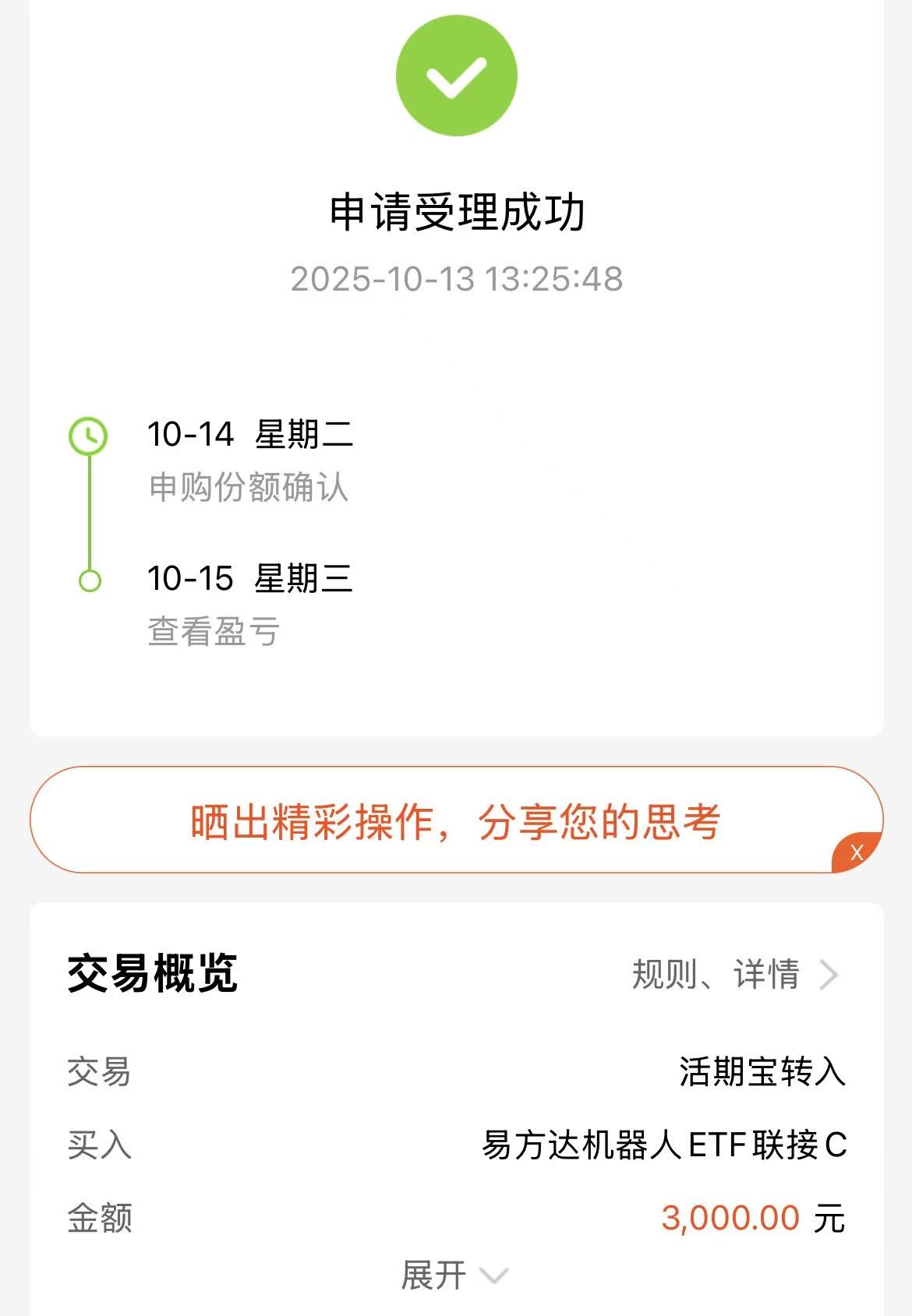 今天A股震荡调整,盘面绿的发慌呀,机器人也是调整幅度比较大的,但是这也恰好是个机会呢,$易方达机器人ETF联接C(OTCFUND|020973)$聚焦机器人全产业链,覆盖核心零部件、整机制造等环节,近三个月涨幅29.43%,近一年涨幅47.7%,业绩优秀,人形机器人占比较高,我觉得今年主线也是在人形机器人的,所以我继续看好未来!