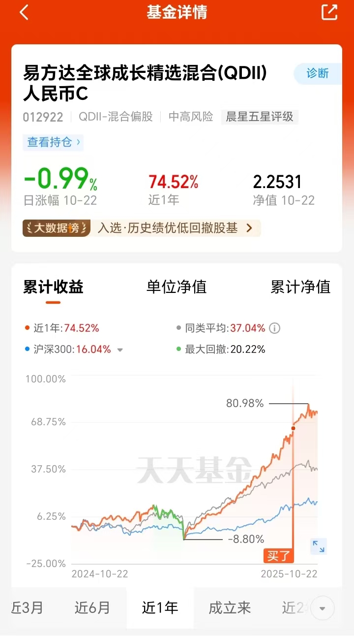 易方达全球成长精选混合C布局全球科技龙头,不押注单一市场,既能依托港股估值修复打底,又能捕捉美股 AI 算力的长期行情,避免了单一市场波动的风险。即便近期板块调整,它也凭借基金经理的调仓能力控制住回撤,近一年 74.52% 的领先涨幅更验证了其长期盈利能力,这样的配置属性很适合长期持有,我会继续拿着等待后续收益兑现。#党的四中全会审议通过“十五五”规划建议#