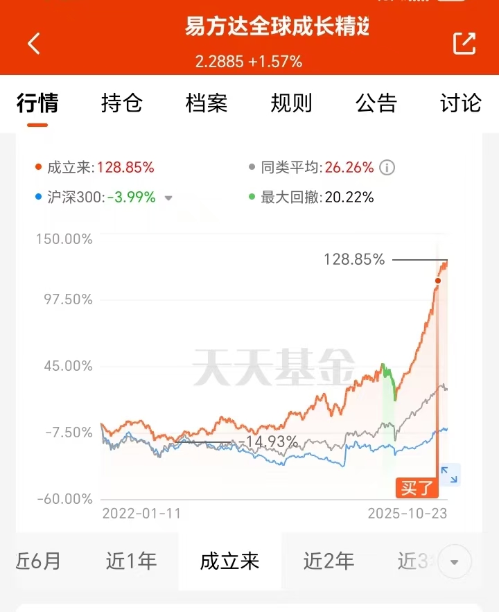 这段时间看着科技板块起起伏伏,还好我之前选的易方达全球成长精选混合扛住了。美降息后我就认准科技长期机会,这只覆盖全球科技龙头,既能沾港股估值修复的光,又能抓美股AI算力的行情。前阵子板块调整,好多基回撤明显,它却控得很稳,成立以来128.85%的涨幅也亮眼,这陡峭的向上走势看着也安心,近几天科技板块持续回暖反弹了,我会继续持有等更多收益。