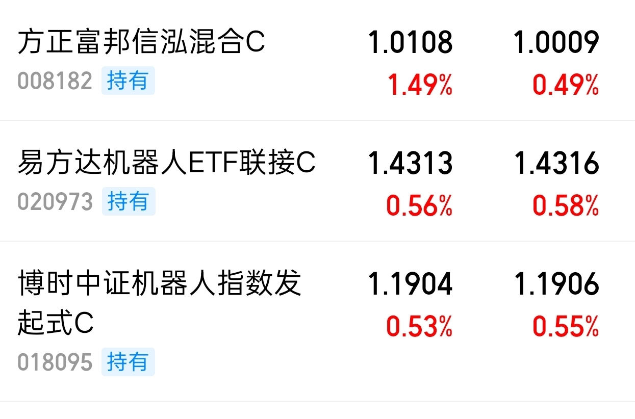说实话,我定投机器人不是因为我多懂,而是发现身边变化越来越多——仓库、医院、餐厅都有机器人了。中美都在发力,我觉得值得参与一下。今天小赚,继续按计划走。$方正富邦信泓混合C$ 今晚涨了1.49%,棒棒哒