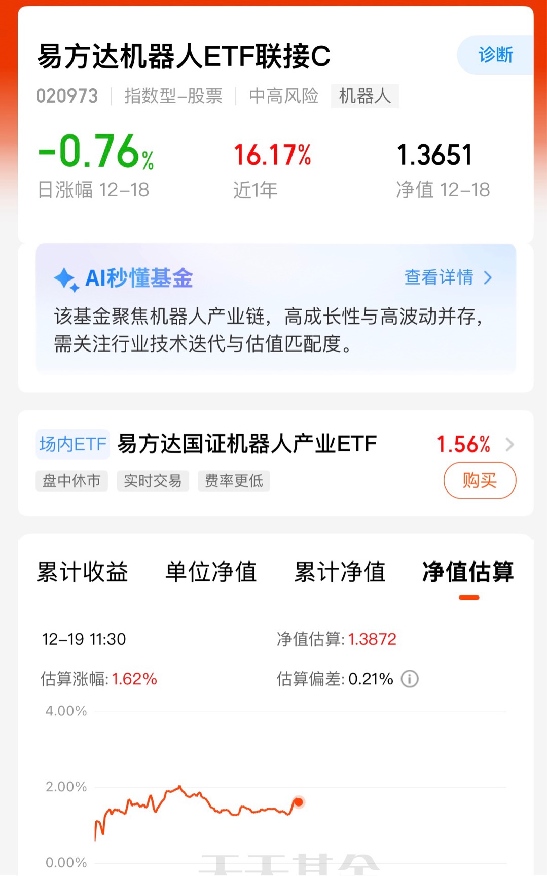 机器人板块可以说真的是迎来春天了,最近机器人行业利好不断,今天人行机器人板块上涨三大指数也在跟着拉升,他是AI的重要应用方向,我打算长期关注, 易方达机器人ETF连接C跟踪相关指数人性机器人占比高业绩又比较优秀,近半年以来的涨幅达到12.93%今年以来已经涨了18.62%,近期行情波动挺大的,因为快到年底了,我觉得指数基金可能会更让我放心一点