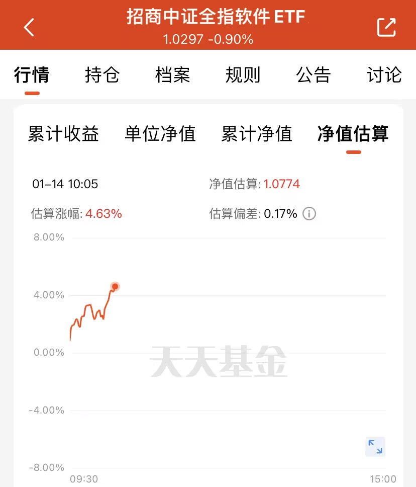 市场若出现明确回调信号,被动进场的投资者哪怕承受损失,也得果断离场。但长期牛市预期还在,没人愿意轻易下车。$招商中证全指软件ETF发起式联接C(OTCFUND|018386)$估值涨 4.63%,网罗行业核心科技标的,近 1 月涨幅达 29.35%。它主攻国产 AI 软件,赶上政策利好密集期,正是 AI 软件赛道的优质之选。