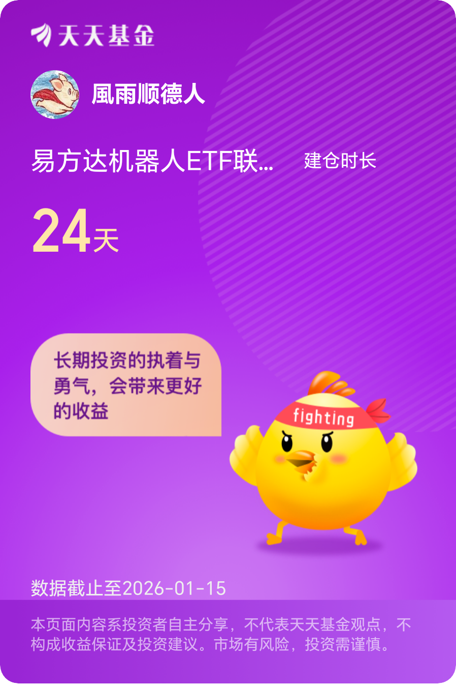 在机器人布局方向,我看好$易方达机器人ETF联接C$ ,它对标的是国证机器人产业指数,T链机器人含量更高一些,相比中证机器人指数基金来说,它的弹性更大!我是去年12月份参与的,目前持有24天,当前收益是12.75%,给我的体感很是不错。我认为市场从纯概念炒作重回业绩驱动,只有业绩过硬、行业高景气的行业才能脱颖而出,易方达机器人ETF联接C在2026年的机会依然很大,我继续看好!