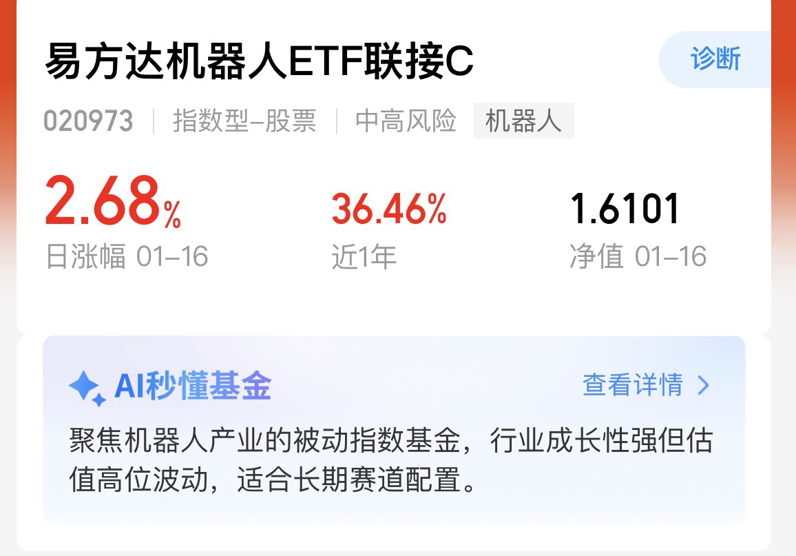 今天大盘行情分化,三大指数涨跌不一,目前来看机器人方向迎来不错的反弹,八部门发文推动人工智能加制造明确了2026年人性机器人规模化量产目标$易方达机器人ETF联接C$ 这只基金精准跟踪国证机器人指数,人形机器人占比比较高,后面继续看好
