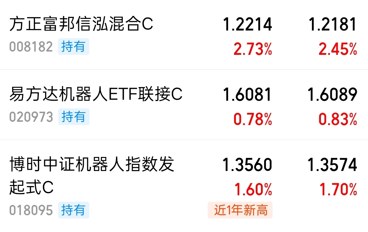 最近机器人公司财报有个共同点:海外收入占比明显提升。欧洲、东南亚都在采购中国产的机械臂和移动底盘。不是靠补贴,是靠性价比和响应速度。全球化落地,打开了更大的想象空间。$方正富邦信泓混合C$ 今晚涨了2.73%,未来可期的呀,涨的多
