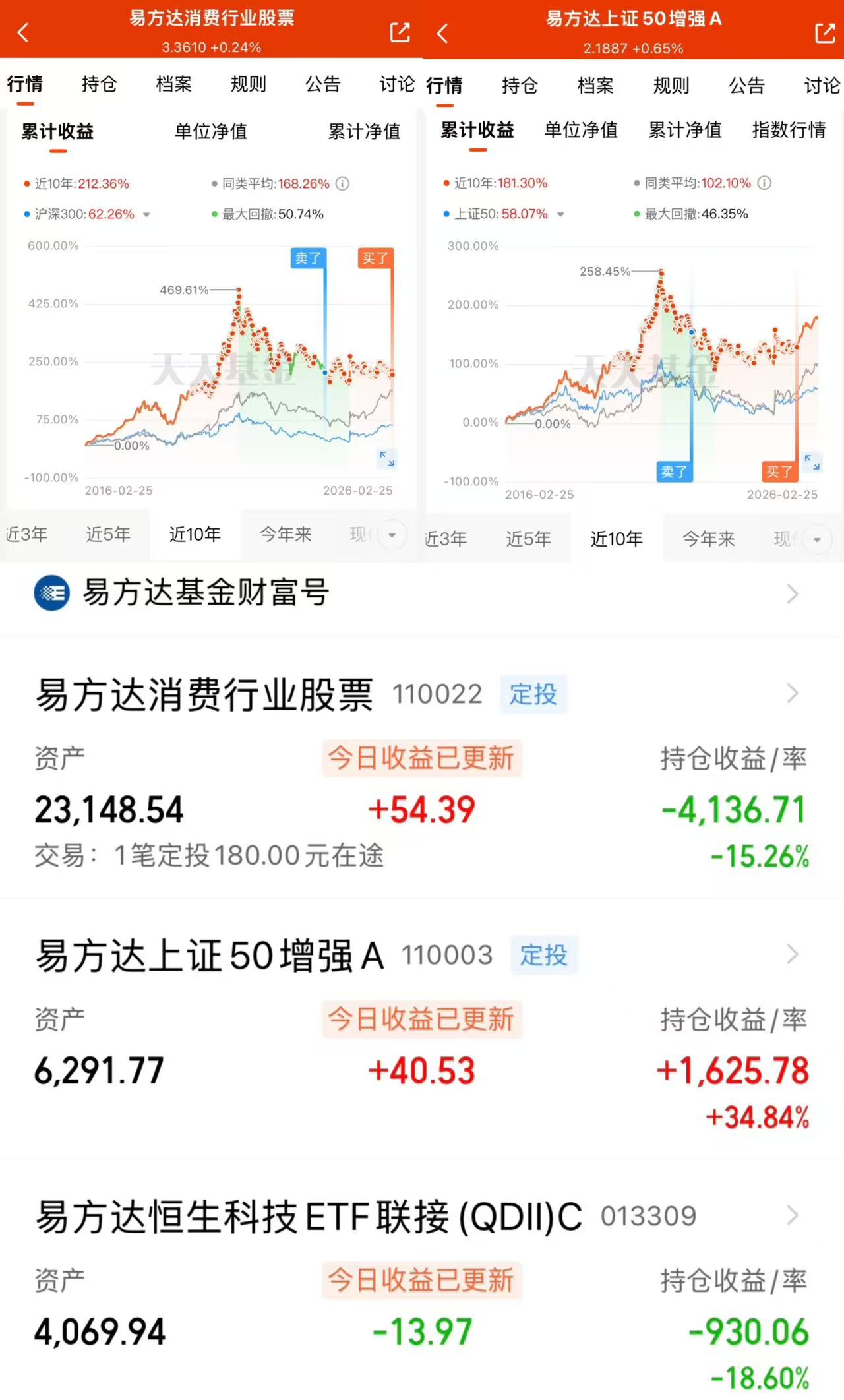 同时,在天天基金网我又设立了多只易方达基金的“慧定投”计划,以金牛基金经理张胜记先生的大盘指数宝藏基金——易方达上证50增强A(110003)的红利资产作为底仓“核心”,以金牛基金经理萧楠先生和王元春先生的宝藏行业主题基金——易方达消费行业(110022)的成长资产作为增收“卫星”,从2019年定投开始,坚持至今都将近7年时间,不可谓不长情。同时,我还持有易方达恒生科技ETF(QDII)C(013309)。虽然,尚未取得正收益,但依然会坚持下去春种静待秋收!