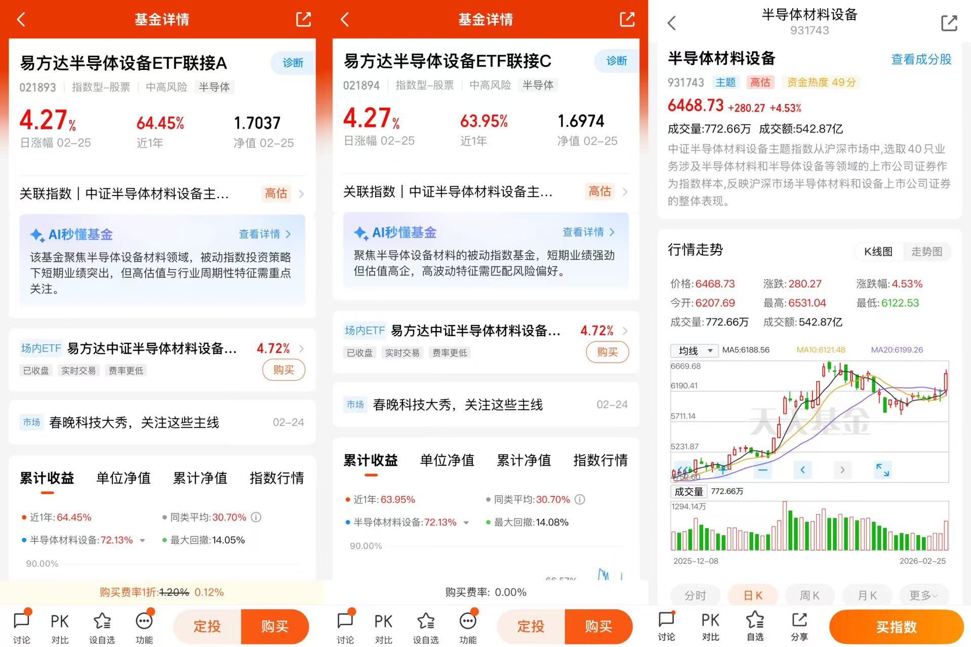 (2)算力端-硬件:明星基金经理李树建先生的易方达半导体设备ETF联接(A:021893;C:021894)紧密跟踪中证半导体材料设备主题指数(931743),该指数从沪深市场中,选取40只业务涉及半导体材料和半导体设备等领域的上市公司作为指数样本,反映沪深市场半导体材料和设备上市公司证券的整体表现,受益于AI算力、国产替代及先进制程扩产趋势。经济工作会议明确 “人工智能+”为国家战略,专项债与税收优惠将持续向AI基建倾斜。长期来看,AI+产业革命正在重塑全球科技格局。易方达半导体设备ETF联接A(021893)“近1年”阶段涨幅高达50.4%,远超同期沪深300指数的5.97%,在4284只同类基金中排名高居第95位。