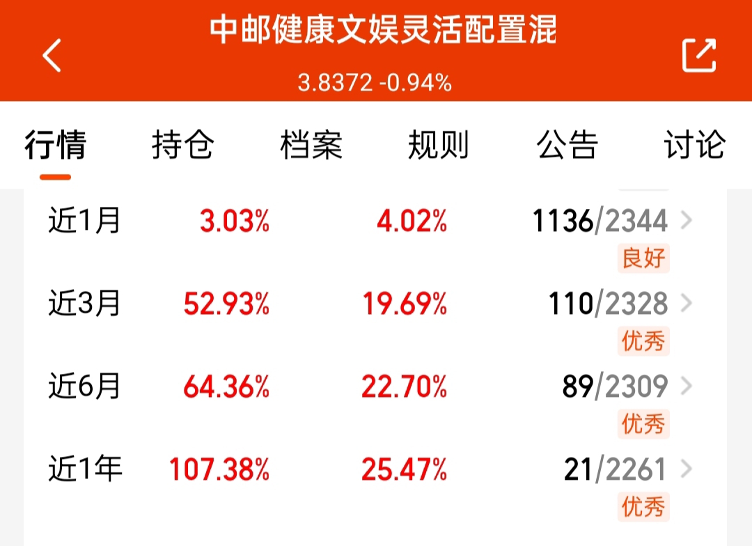 长期看科技还是算力基比较给力,$中邮健康文娱灵活配置混合C$ ,近一年都涨了超107个点,AI应用+算力,最有潜力方向度涵盖了,长期表现杠杠滴