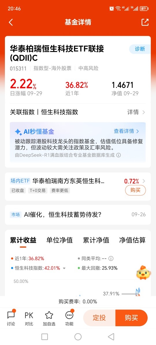 家人们快看!今天A股收盘后,恒生科技指数“支棱”起来了,跌幅收窄了不少。国庆期间港股不休市,说不定能来一波“假期行情”。这时候不布局华泰柏瑞,更待何时?它今天净值涨了2.22%,近1年收益36.82%,跟恒生科技指数高度同步。现在买入,说不定就能跟着这波反弹吃肉!