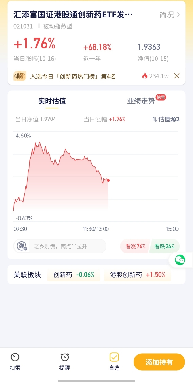 【汇添富国证港股通创新药E基金估值播报+10.16行情】今日估算涨幅+1.76%!收益提前看+当日医药板块发力1. 今日A股走得挺有意思,医药板块猛冲,新能源汽车也跟上了,可半导体、港股科技那边就蔫了,涨跌分化看得人眼花缭乱。