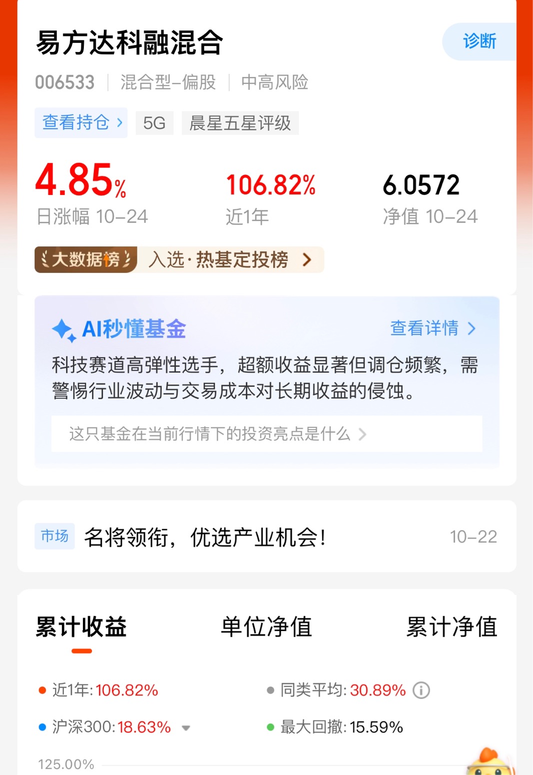 近期科技赛道表现出色,但细分赛道轮动快,单一布局不好把握。易方达科融混合的优势在于均衡,同时拿科技、新能源、军工,既能吃到科技的成长红利,又有新能源、军工托底,近半年涨幅超110%,和近一年106.82%的业绩都很突出。机构也认可,这种攻守兼备的配置,很适合当下行情,我也继续拿稳筹码,期待收益在创新高。