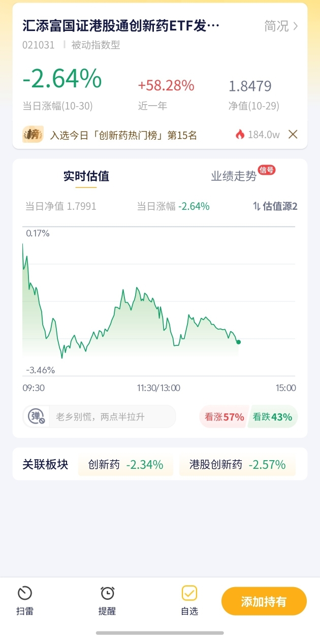 汇添富国证港股通创新药今日预估涨幅-2.57%!创新药板块表现低迷,该基金在自选榜中表现不佳。