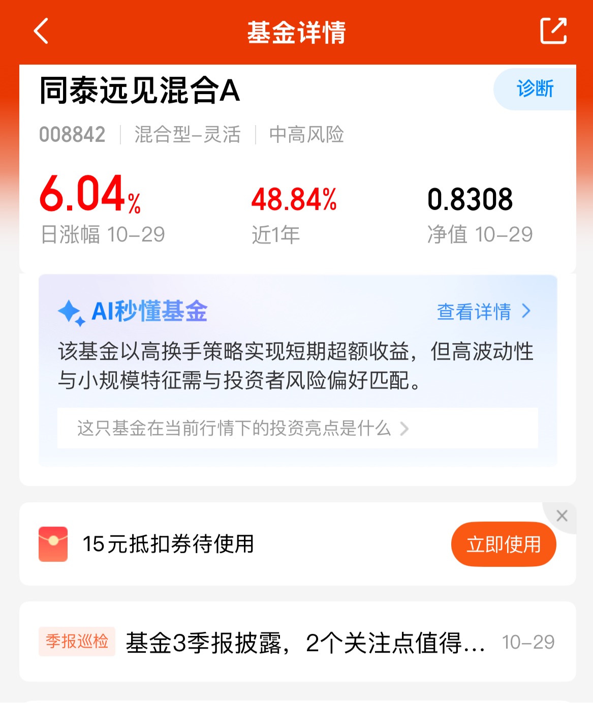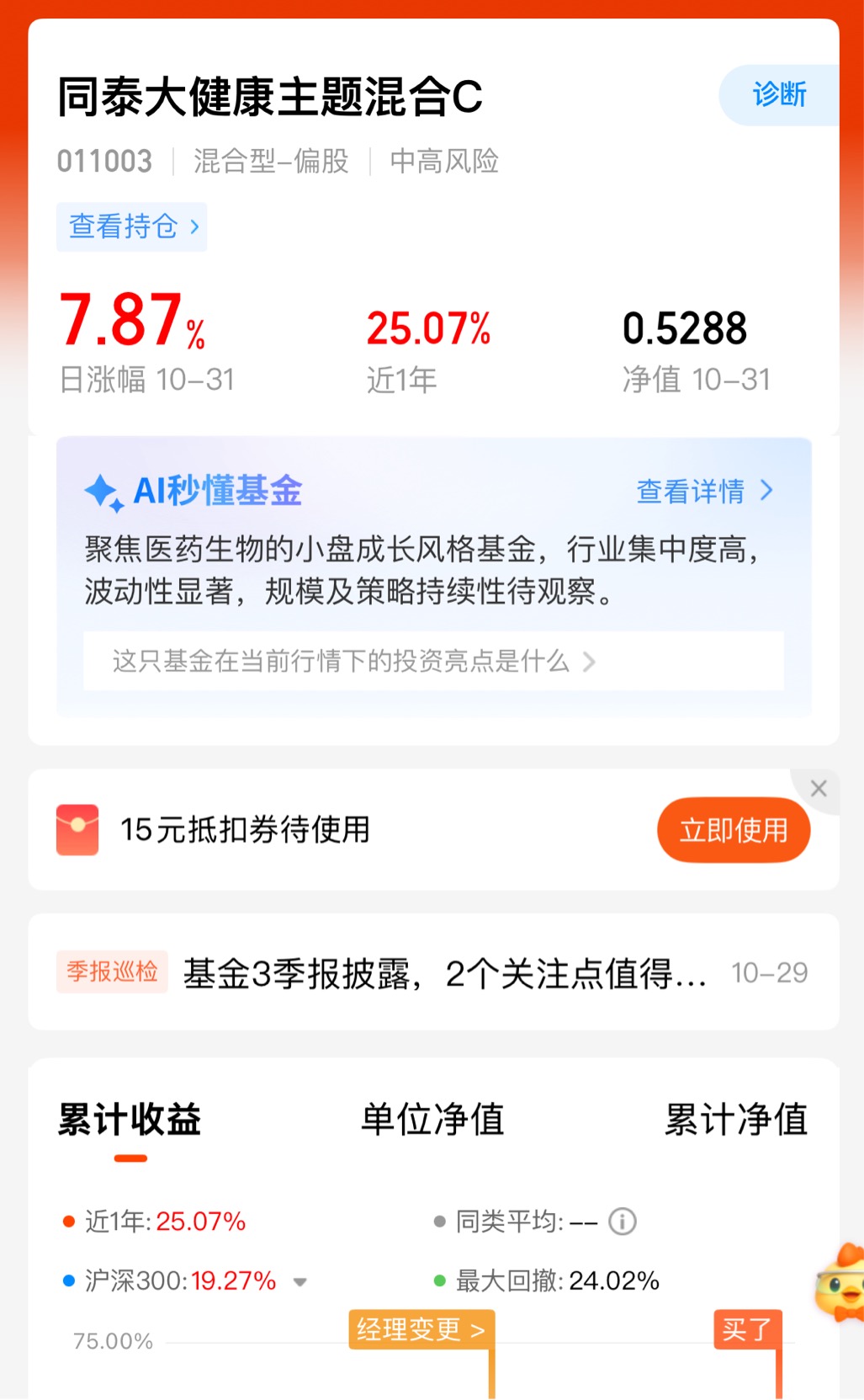 实盘持有的$同泰大健康主题混合C$ 周五暴涨7.87%,还真有些意外!同时持有的$汇添富国证港股通创新药ETF发起式联接C$ $景顺长城中证港股通创新药ETF联接C$ 涨3.47%和2.54%,“毒药”萎靡不振了这么久,主动基金率先大力反弹,也是主动基金的优势,评论区骂基金经理调仓的可以暂歇了,他用涨幅证明了自己。(亏损是我自己不该高位加仓太密,并不认为基金的原因,毕竟基金风格不能漂移)