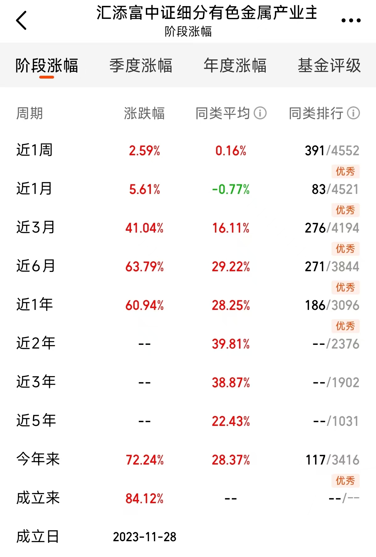 还是觉得$汇添富中证细分有色金属产业主题ETF发起式联接C$(019165)这种“高铜含量”的基金拿着安心。它不光有30%的铜,还有14%的黄金傍身。还是这些地底下的资源啊。铜这东西,既是盖房修路要用的,现在更是搞绿色能源、人工智能离不开的,需求硬得很。跟中信保诚800有色C(013081)相比,汇添富细分有色近一周和近半年的业绩都跑在前面,实际弹性就是更高点,确实更值得关注。#10月投资总结:我的收益如何了?#