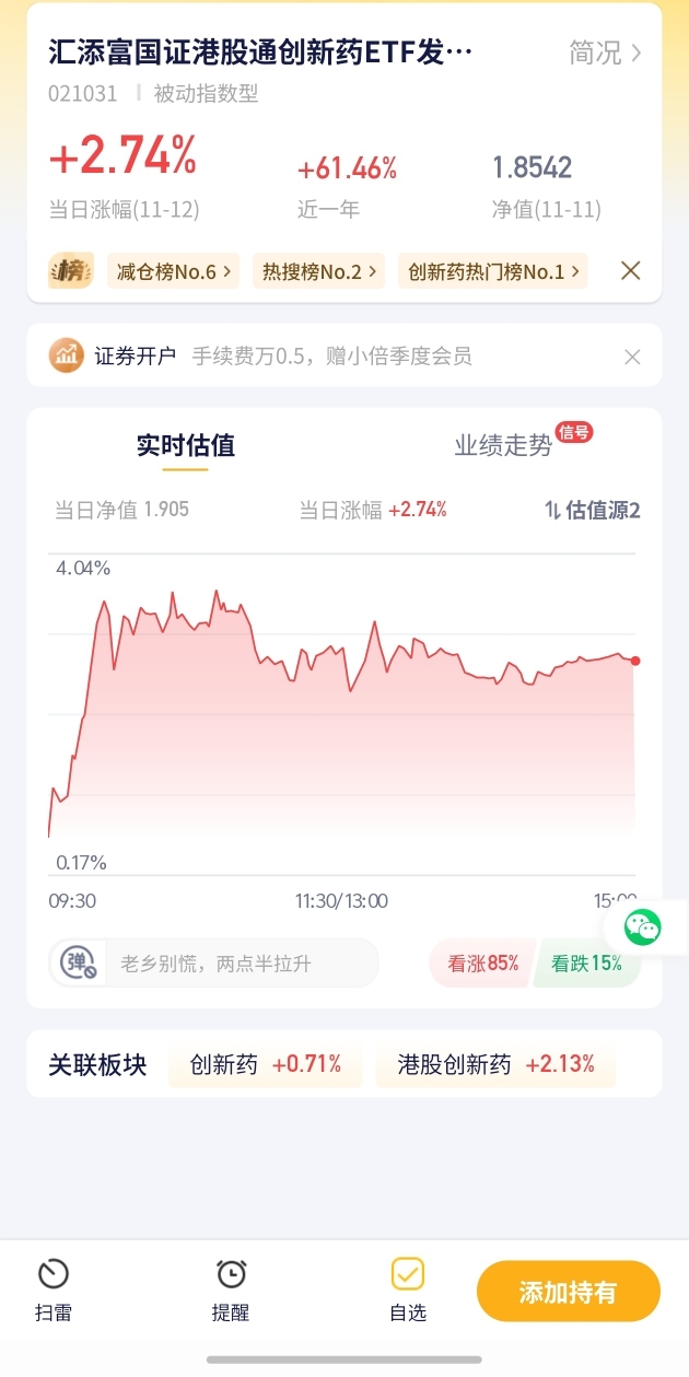汇添富国证港股通创新药E今日预估涨幅+2.74%!创新药板块表现亮眼,该基金领涨自选,还不错