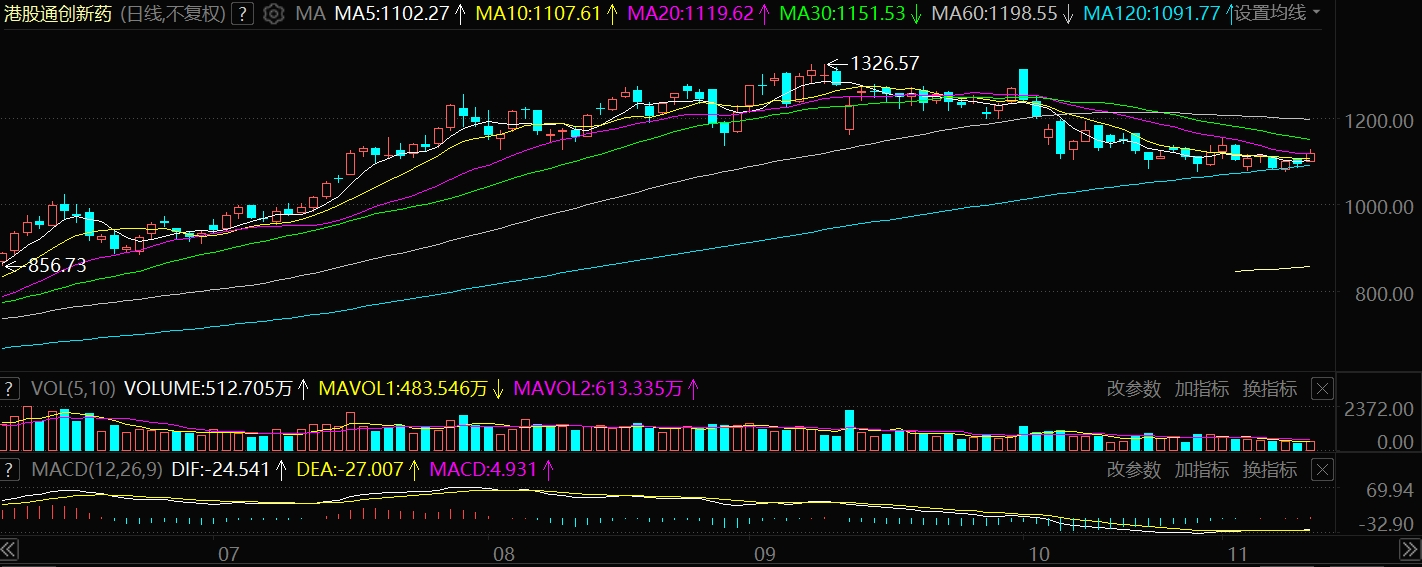 开金手指了,前天买黄金上涨,昨天买创新药又上涨,爽歪歪。从技术面看,创新药缩量震