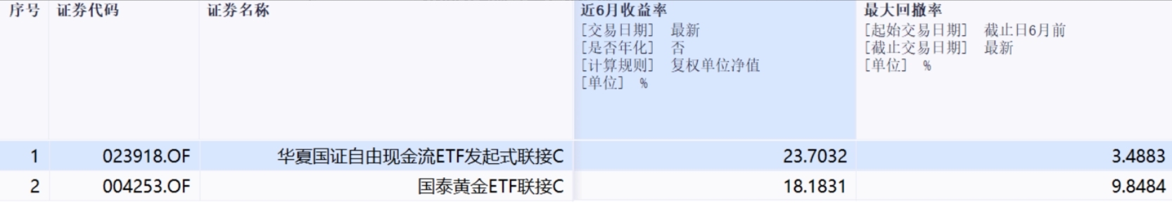 虽然黄金是公认的避险能手,但是发现自由现金流比黄金性价比还好,昨天收益0.21%,近6天5天正收益,回撤只有3%+,尤其是比国泰的黄金基收益更高波动更小,我先上车了$华夏国证自由现金流ETF发起式联接C$