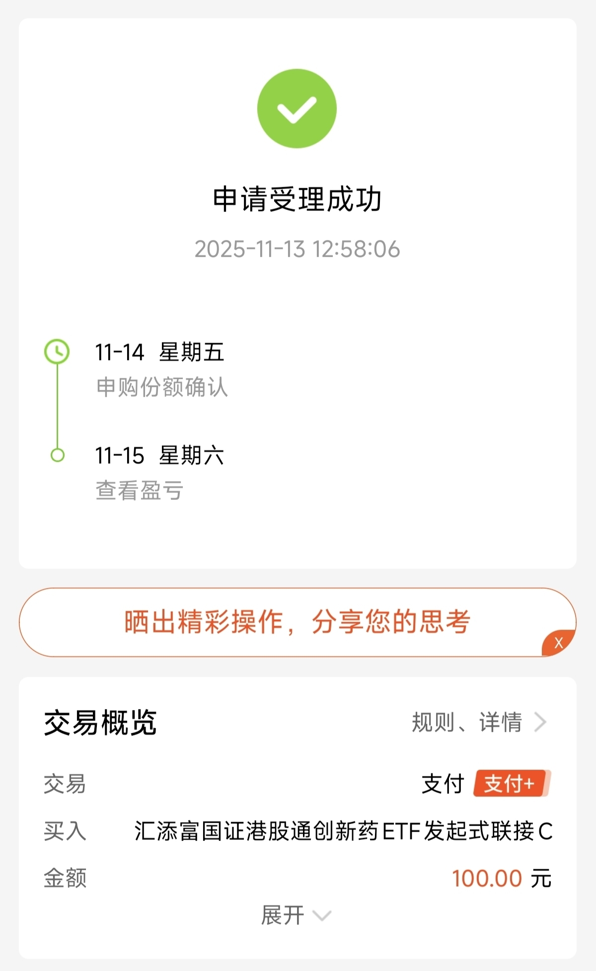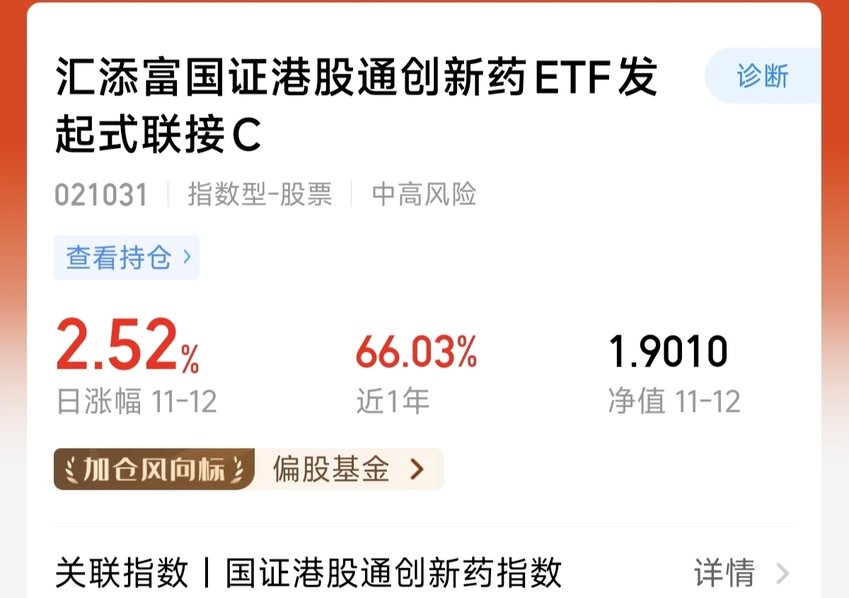 今天又关注到$汇添富国证港股通创新药ETF发起式联接C$ 是聚焦创新药的指数基金,紧跟跟国政港股通创新药指数,全面覆盖创新药全产业链,跟踪国证港股通创新药指数,深度ADC、双抗、脑机接口等前沿领域,长期的表现一直是非常不错,昨天上涨了2.52%,同类医药基金涨幅第一。近一年涨幅66.03%。是同类平均业绩的两倍还多。由于是100%纯度的港股创新药,所以弹性更大,今天的估值马上又要四个点了。不得不说,还是港股创新药的爆发力更强!我非常刚好未来在医药上涨中的收益表现。今天也开始加仓100定投,择机继续补仓