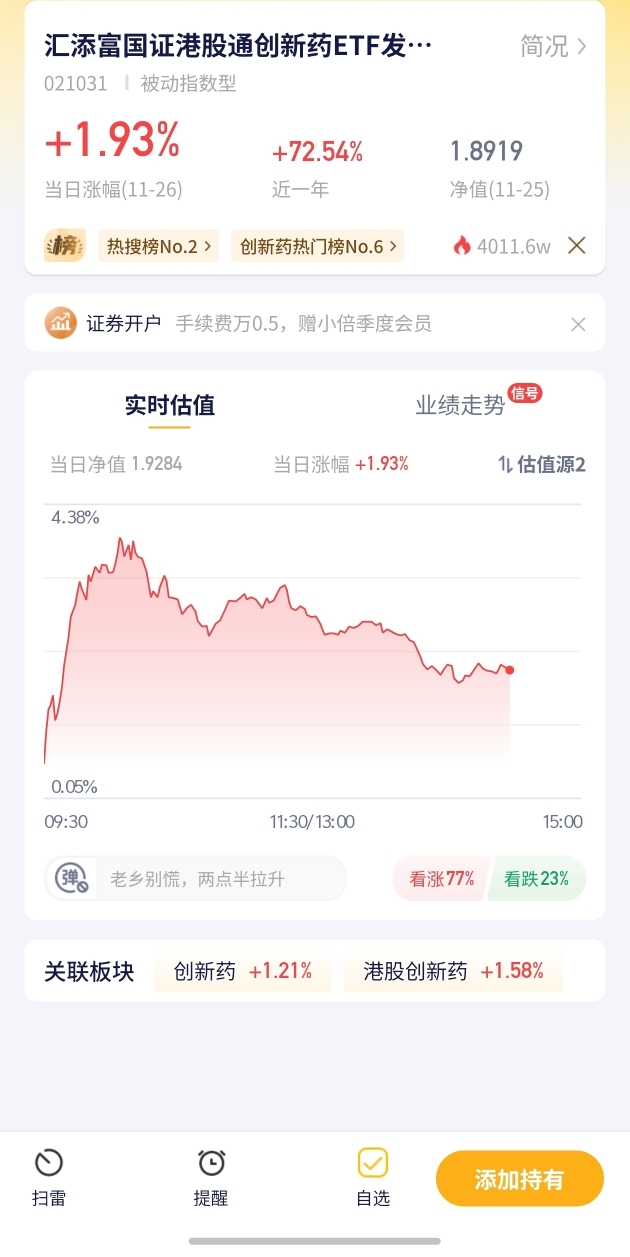 汇添富国证港股通创新药E今日预估涨幅1.95%!港股创新药板块有所回暖,这只基金跟上了节奏