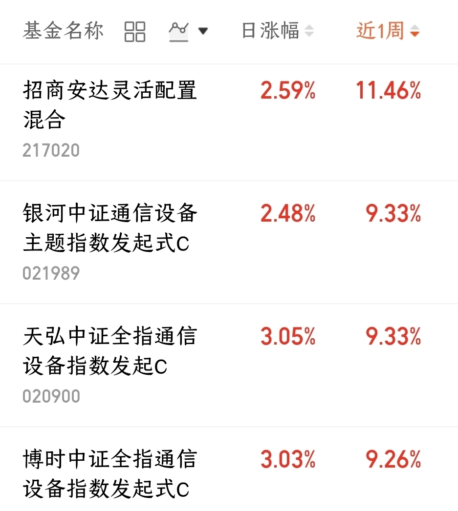 比如$招商安达灵活配置混合$ 近一周涨幅11.46%