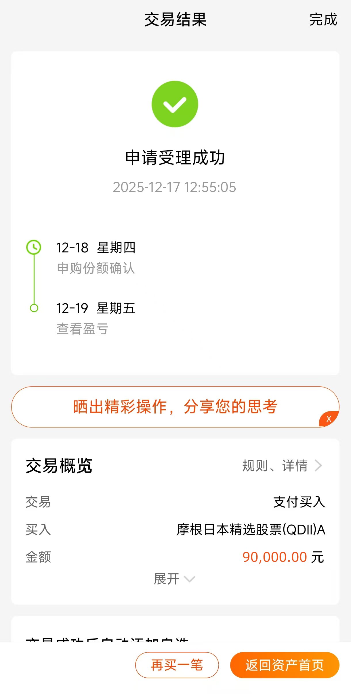 我今天买了点$摩根日本精选股票(QDII)A$(007280),看到摩根这个产品就放了10万的额度,现在QDII额度这么稀缺,这个机会确实要赶紧抓住。美国那边市场风险加大,资金有向日本股市转移的趋势,日股现在机会不错。日本经济复苏步伐加快,出口表现强劲,这让日本央行加息的预期更强烈了。根据12月17日分析师Eamonn Sheridan的说法,最新公布的日本贸易和投资数据强化了市场判断,日本央行本周很可能加息25个基点。继上一季度经济收缩后,复苏的迹象正不断增强。日本11月份出口连续三个月增长,同比增幅达6.1%,明显高于市场预期。这主要得益于欧美市场的强劲需求,以及美国贸易协议落地后全球半导体需求的复苏。对美出口增长8.8%,对欧盟出口增长近20%,显示外部动力在改善。额度稀缺是现实,目前能投日本的场外基金就两只,都有限额。摩根日本精选基金每日10万元的额度算比较充足的,还能规避ETF的溢价风险。它是全市场仅有的主动管理型日本基金,不只是跟踪东证指数,还做了汇率对冲(成立以来对冲收益超27%)和个股精选,旨在为投资者提供更好的日股投资方案。巴菲特对此表示高度认可!“计划投资50年以上”!在2025年最近的伯克希尔哈撒韦股东大会上,巴菲特强调:“我们对日本的投资,是着眼于至少50年的长期持有!”他还表示:“日本的稳定性让我更有信心。”日本股市目前有三重利好支撑:企业治理改革(超85%公司有薪酬委员会)、通胀与工资正循环(春斗加薪5.5%)、估值吸引力(MSCI日本市盈率仍低)。投资日本,后续潜力值得关注。另外,日经225指数里科技股权重高,波动可能较大,而东证指数行业分布更分散,走势相对稳健,是进行日本市场配置的稳妥选择。#【跨年坦白局】提问金梓才、陈果#