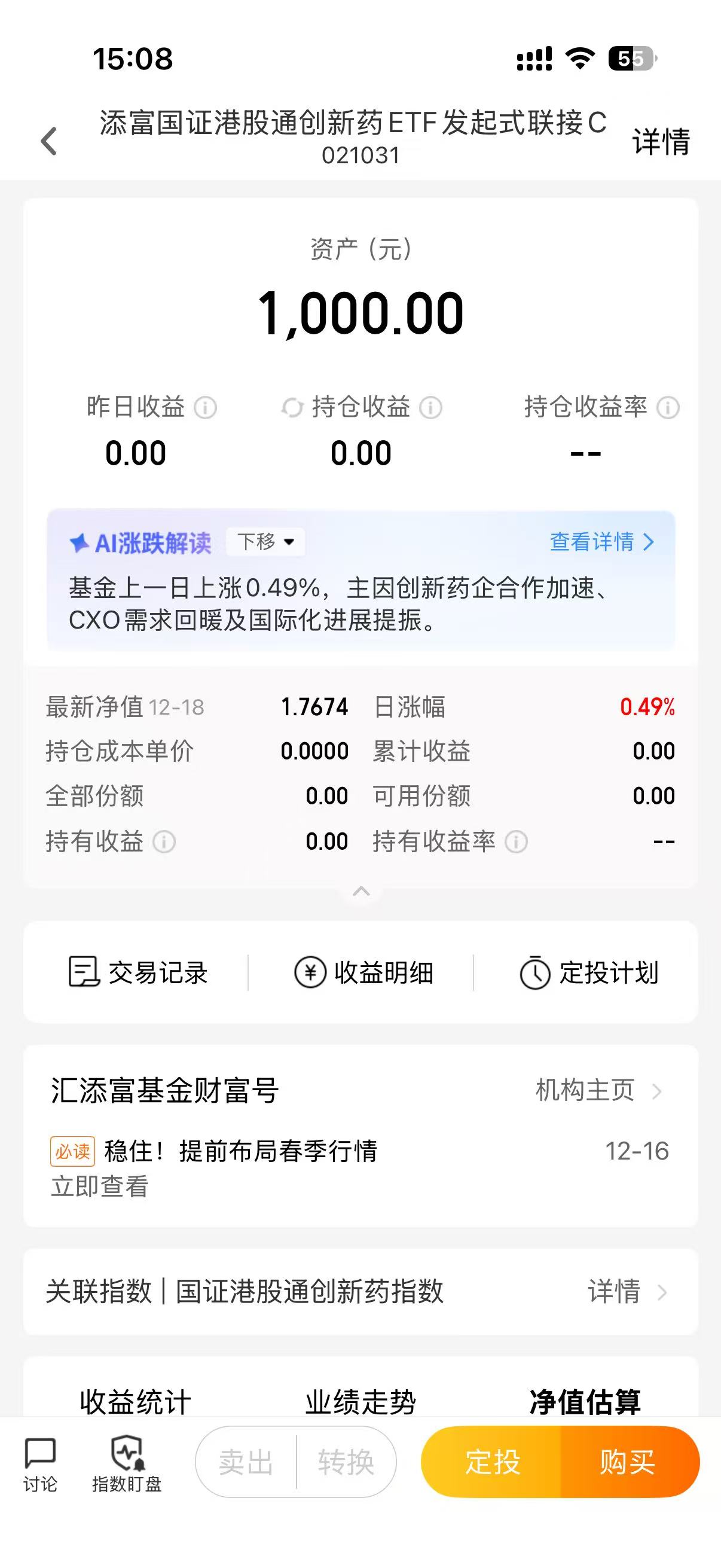 从11月进入流感高峰期,也带动创新药相关标的持续上涨,所以近期板块整体表现也是放量上行,情绪开始修复。那信儿觉得这个时候开始布局风险也比较低。信儿关注的$汇添富国证港股通创新药ETF发起式联接C(OTCFUND|021031)$综合费率0.8%低于同类港股创新药指数,远低于主动类医药基金,而且7免也比较灵活。今天加仓一份汇添富港股通创新药,昨天逆势抗跌,今天大阳修复,妥妥的企稳回升的右侧加法点位,所以信儿直接把握买点!基本面上,创新药板块景气度是能够持续的,"创新+国际化"创新药产业趋势不变,始终是医药板块的核心方向。当前我国创新药已实现从量变到质变的转化,在新靶点、新技术、新疾病领域的布局已呈现领先趋势,自有它风起之时。港股通创新药指数弹性好,估值低,不说了,抄底!