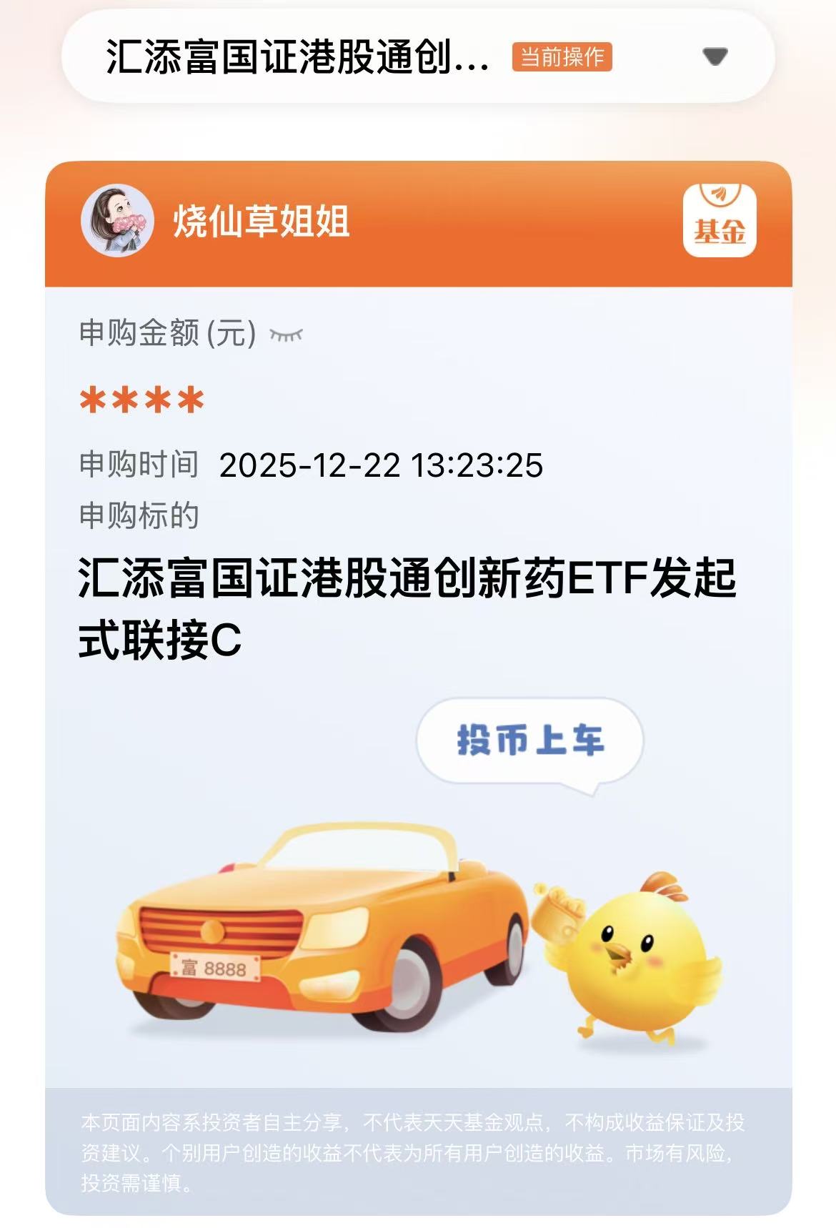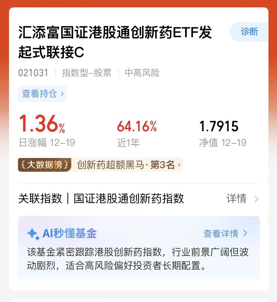 $汇添富国证港股通创新药ETF发起式联接C(OTCFUND|021031)$紧密跟踪的国证港股通创新药指数实现100%纯创新药含量,持仓聚焦百济神州、信达生物等龙头企业,7天免赎回费,综合费率仅0.8%,低于同类,我长期看好创新药未来趋势,今日逢低布局起来。