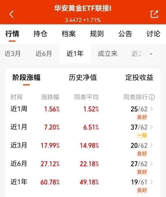 黄金行情太顶了!华安黄金 ETF 联接 I 近一年黄金指数收益最高,费率全市场最低,7 天免赎,今年 60 点$华安黄金ETF联接I$