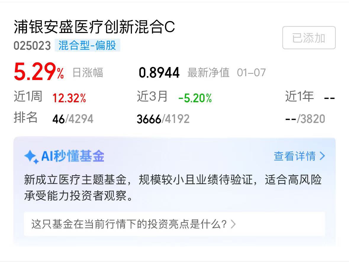 新发基$浦银安盛医疗创新混合C$ 当日大涨5.29%,周一就大涨超6%。它没有历史包袱,弹性高,现在正是布局创新药的好时机,抓住机会上车了#暖阳创作计划#