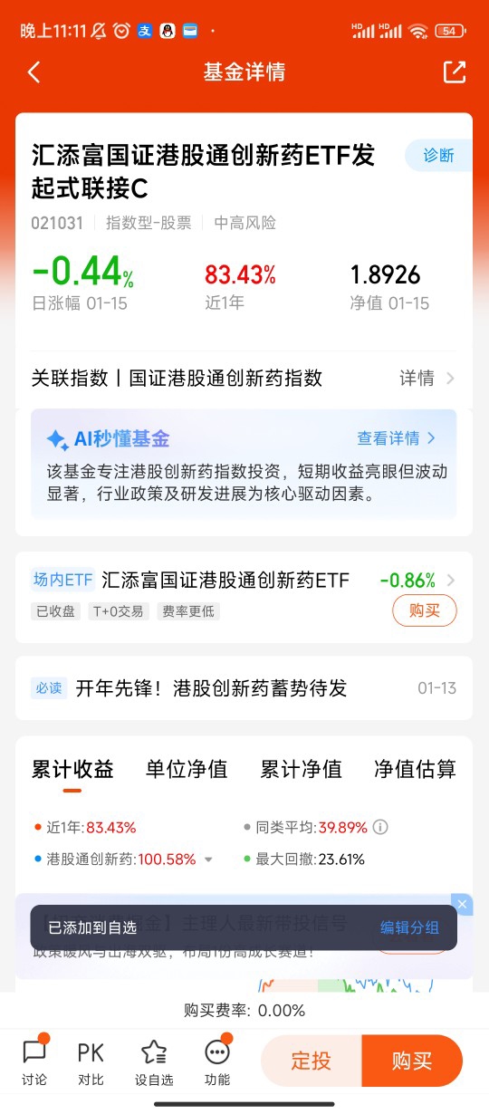 尊敬的乐无穹经理,您好!我是汇添富国证港股通创新药ETF发起式联接C的持有人。想