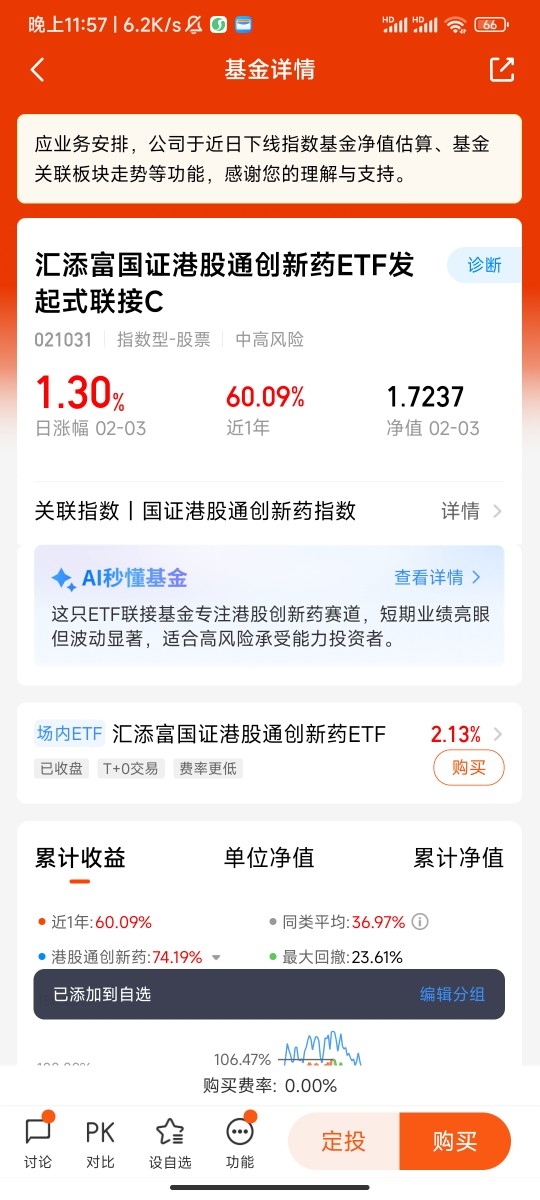 通过ETF工具参与创新药投资,可以分散单一技术路线或单一企业的风险,同时保留创新药主题的弹性。汇添富国证港股通创新药ETF发起式联接C通过分散投资于产业链多个环节,降低了组合波动,适合普通投资者长期持有。