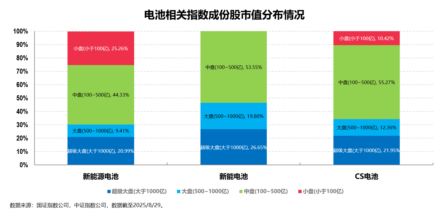 其中的新能电池明显更偏大中盘,不含小盘股;CS电池虽然会覆盖部分小盘股,但比例不高,整体来看也是以中大盘为主;而新能源电池在市值上不仅覆盖大中小盘,而且整体相对均衡。