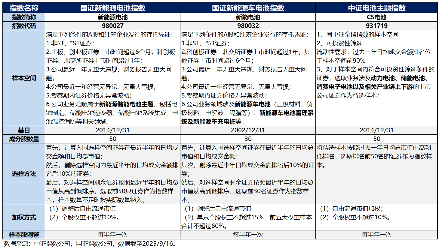 相同的地方在于,三个指数都以在沪、深、北交易所上市的新能源电池以及相关产业链上下游的上市公司作为成份股,也都能一定程度上反映新能源电池产业中上市公司的整体表现。三个指数都是自由流通市值加权,样本股均为每半年调整一次。