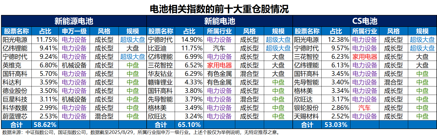 从上图中我们可以看出,三个指数均以电力设备为主要投资方向,截至2025年8月29日,三者的电力设备占比分别为74.80%、64.70%和86.82%,行业集中度均较高。