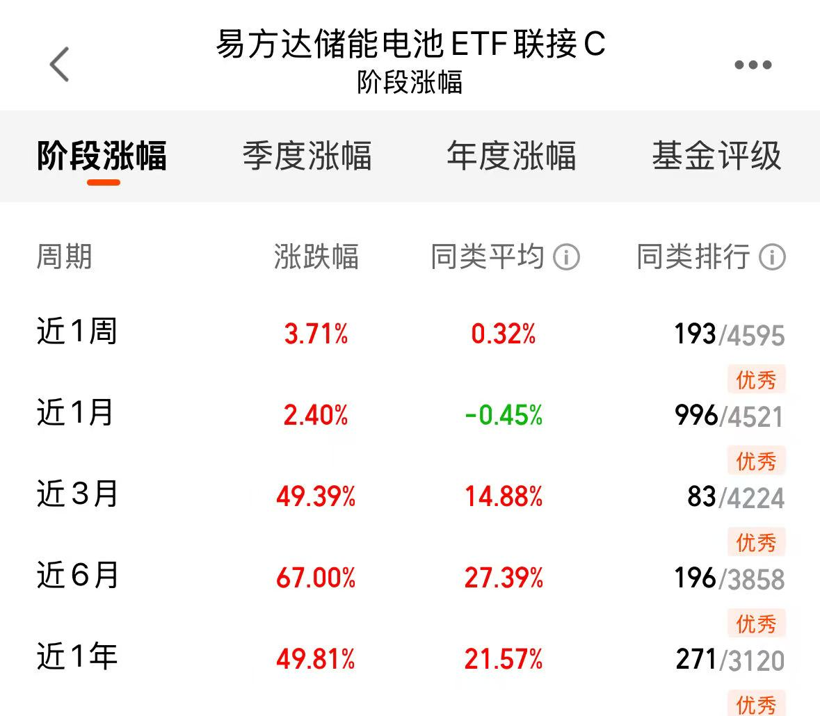 作为全市场唯一聚焦储能电池主题的基金,它今年来涨幅已达 49.81%,三季度狂涨54.2%,完美承接储能行业的超级风口,成为布局这波行情的稀缺工具。