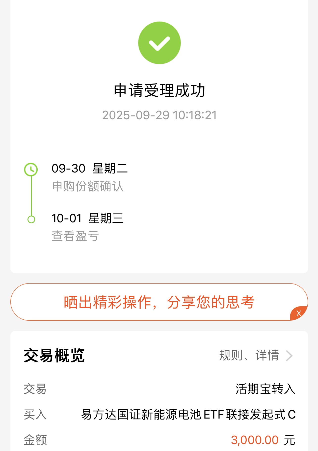 我今天选择建仓易方达国证新能源电池ETF联接,一次性买入3000元。它紧密跟踪新能源电池指数,配置方向清晰,能够直接分享产业红利。对于像我这样在行业轮动加速的阶段不想错过核心赛道的投资者来说,提前卡位是个不错的选择。新能源电池未来的故事,值得长期持有去见证!