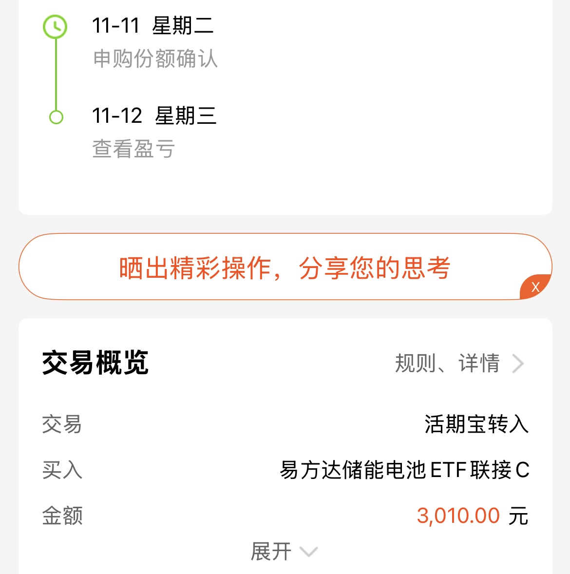今天大盘行情延续震荡了,三大指数均是绿的,下跌的板块比较多,电池方向也迎来调整,不过最近储能热点还是比较高的,而且储能电池指数也是市场唯一一个主投储能板块的产品,$易方达储能电池ETF联接C(OTCFUND|021034)$近三个月涨幅49.39%,近六个月涨幅67%,重仓有阳光电源、宁德时代等龙头,我继续看好未来。#A股低开高走!国际资本看好中国资产# #4000点 到底要不要止盈?# $广发国证新能源车电池ETF联接A(OTCFUND|013179)$ $大成中证电池主题指数发起C(OTCFUND|015998)$